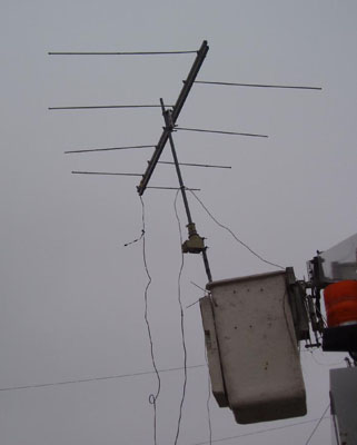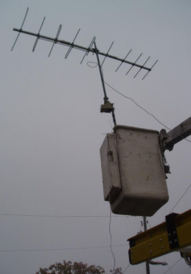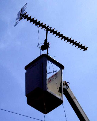 The Biro DTV reception verification survey uses a bucket truck, with rotor-mounted test antenna.. elevated to 35 ft above ground.