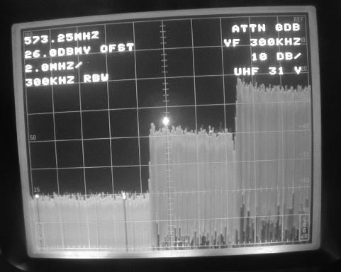 The photograph above shows a serious adjacent channel interference situation, The desired Channel 31 power spectrum, in the center of the screen, was found at a level 15 dB below the undesired adjacent Chanel 32.