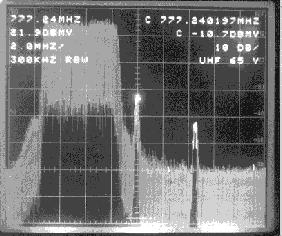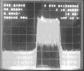 | The Channel 65 video carrier is in the center of the screen. Observe the high amplitude DTV spectrum below the NTSC channel. | This is a "free-standing" DTV carrier. No analog adjacent carriers above or below. |