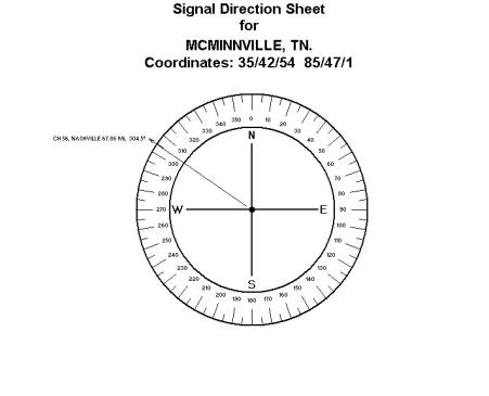 showed the distance of Channel 56, Nashville, as 53.87 miles, the direction as 325.7° Azimuth.